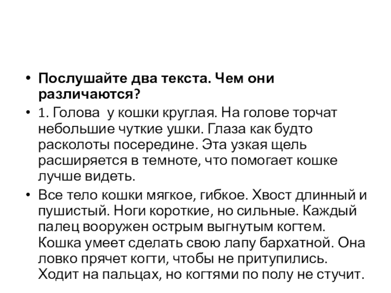 Все тело кошки мягкое, гибкое. Хвост длинный и пушистый. Ноги короткие, но сильные. Каждый палец вооружен острым выгнутым когтем. Кошка умеет сделать свою лапу бархатной. Она ловко прячет когти, чтобы не притупились. Ходит на пальцах, но когтями по полу не стучит.