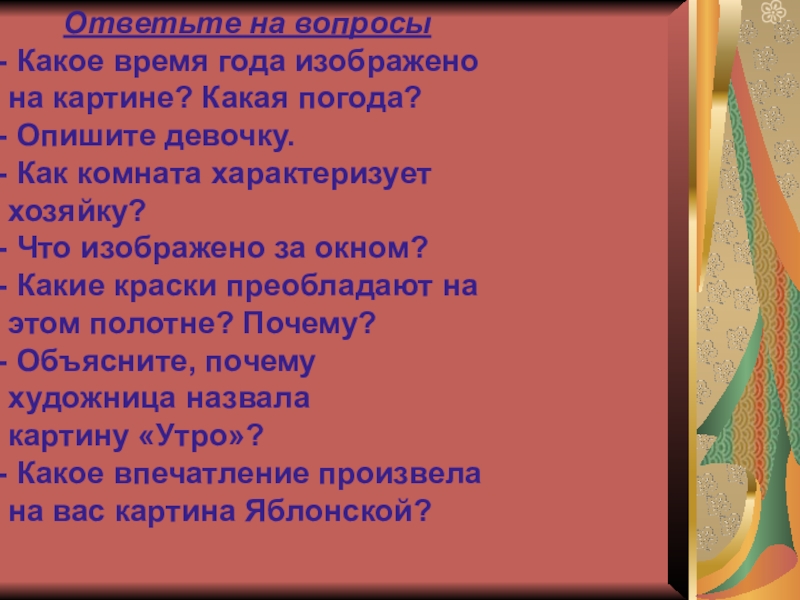 Ответьте на вопросы Какое время года изображено на картине? Какая погода? Опишите девочку. Как комната характеризует хозяйку?