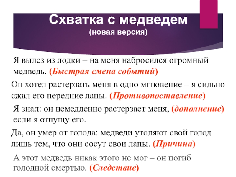 Он хотел растерзать меня в одно мгновение – я сильно сжал его передние лапы. (Противопоставление)