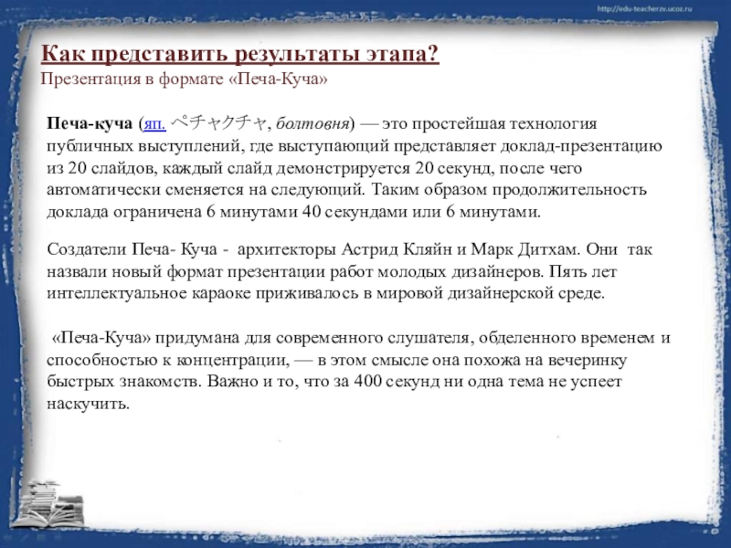 Создатели Печа- Куча - архитекторы Астрид Кляйн и Марк Дитхам. Они так назвали новый формат презентации работ молодых дизайнеров. Пять лет интеллектуальное караоке приживалось в мировой дизайнерской среде.