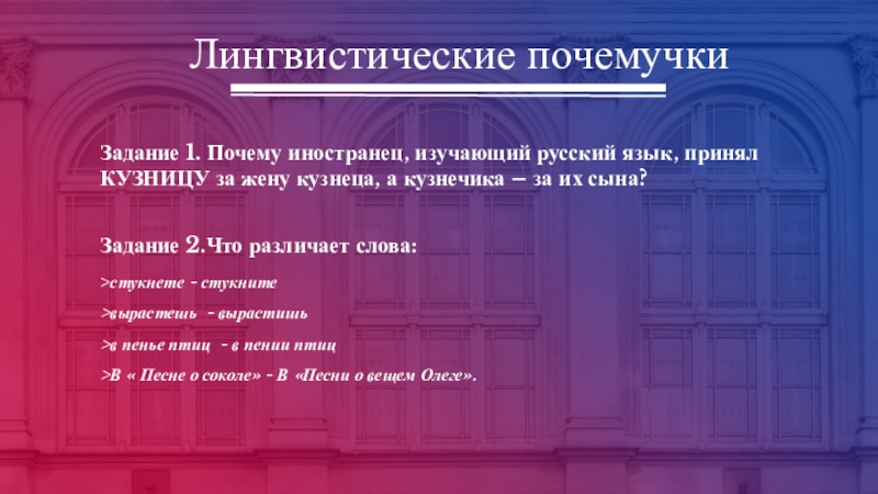 Задание 1. Почему иностранец, изучающий русский язык, принял КУЗНИЦУ за жену кузнеца, а кузнечика – за их сына?
