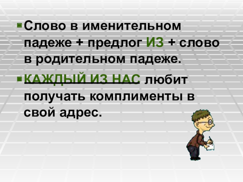 Слайд 10Слово в именительном падеже + предлог ИЗ + слово в родительном