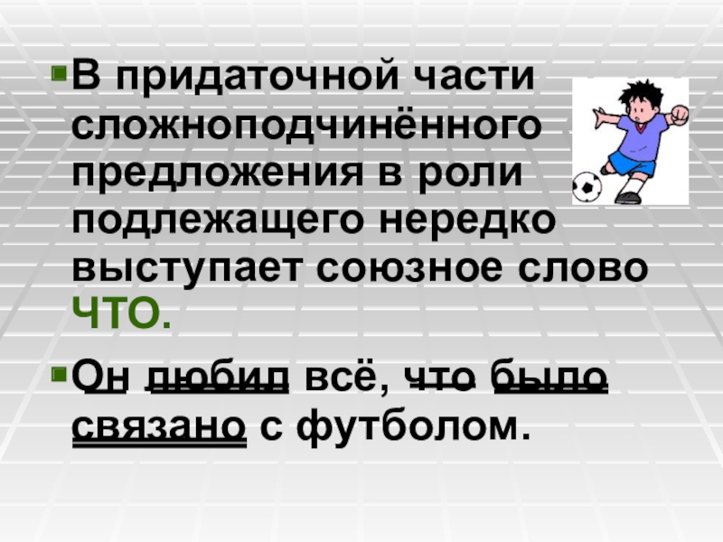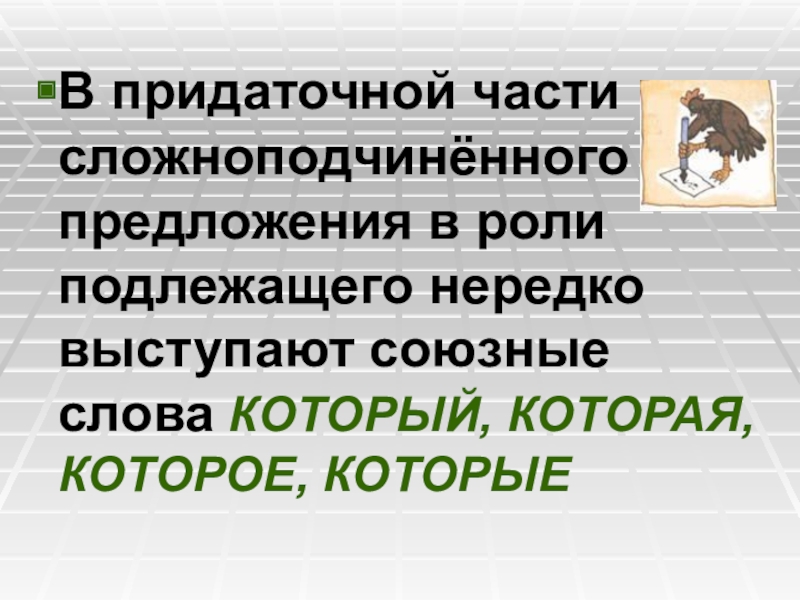 Слайд 7В придаточной части сложноподчинённого предложения в роли подлежащего нередко выступает союзное