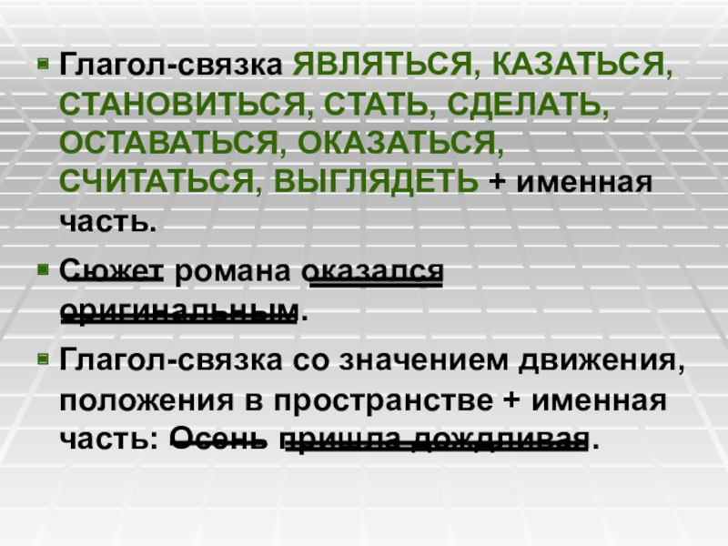 Слайд 20Глагол-связка ЯВЛЯТЬСЯ, КАЗАТЬСЯ,СТАНОВИТЬСЯ, СТАТЬ, СДЕЛАТЬ, ОСТАВАТЬСЯ, ОКАЗАТЬСЯ, СЧИТАТЬСЯ, ВЫГЛЯДЕТЬ + именная
