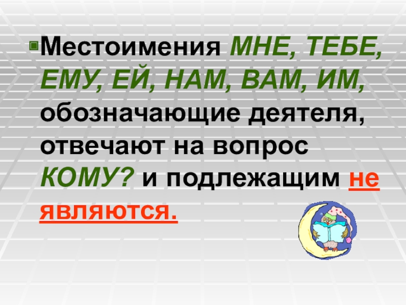 Слайд 3Местоимения МНЕ, ТЕБЕ, ЕМУ, ЕЙ, НАМ, ВАМ, ИМ, обозначающие деятеля, отвечают