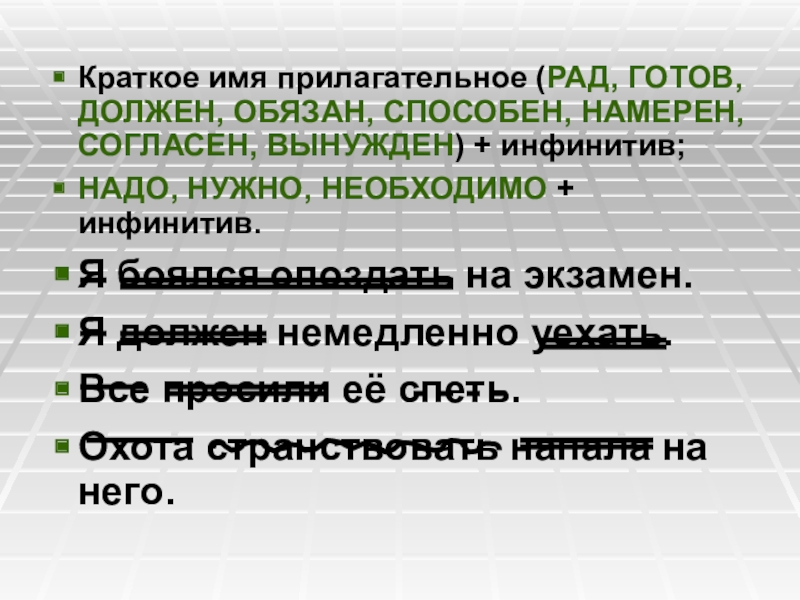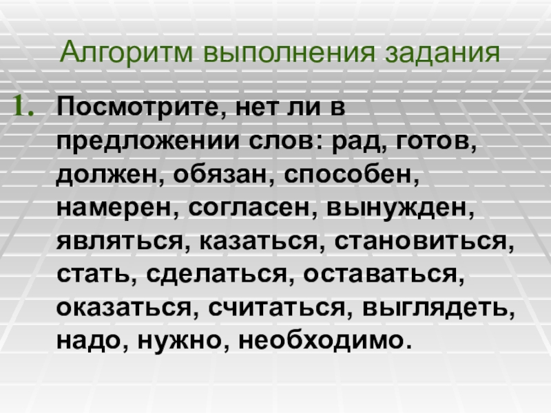 обязан, способен, намерен, согласен, вынужден, являться, казаться, становиться, стать, сделаться, оставаться, оказаться, считаться, выглядеть, надо, нужно, необходимо.