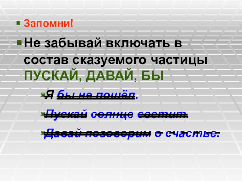 Не забывай включать в состав сказуемого частицы ПУСКАЙ, ДАВАЙ, БЫ