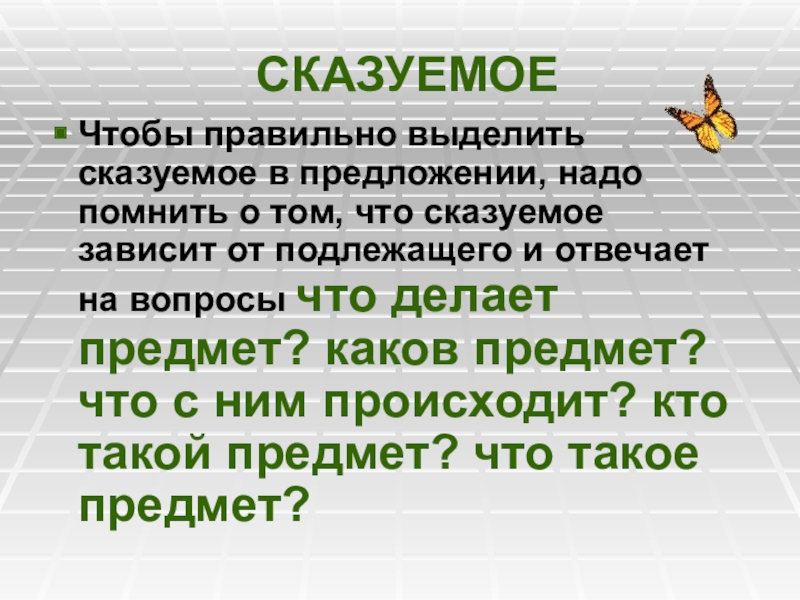 сказуемое зависит от подлежащего и отвечает на вопросы что делает предмет? каков предмет? что с ним происходит? кто такой предмет? что такое предмет?