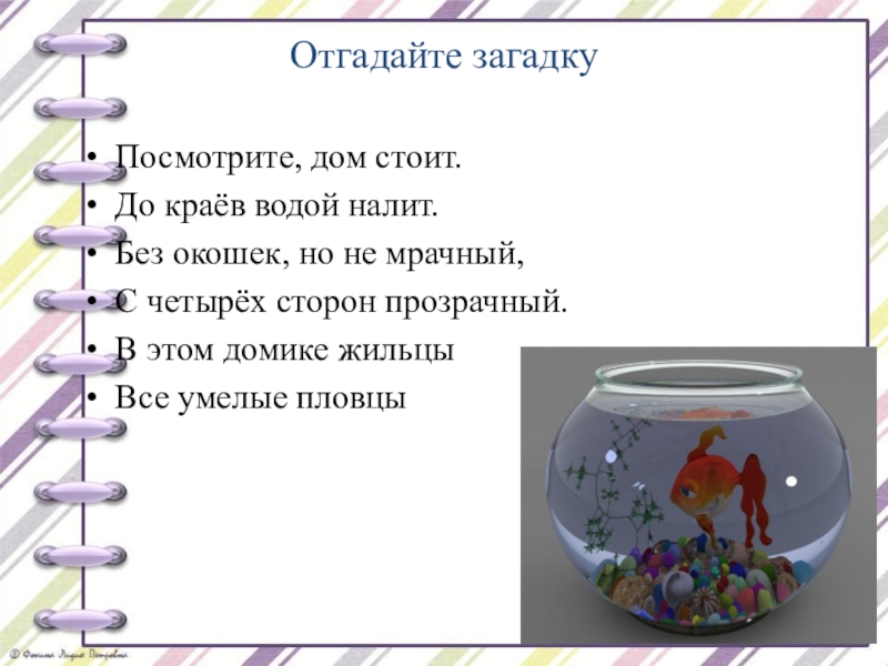 Отгадайте загадкуПосмотрите, дом стоит.До краёв водой налит.Без окошек, но не мрачный, С четырёх сторон прозрачный.В этом домике жильцыВсе умелые пловцы