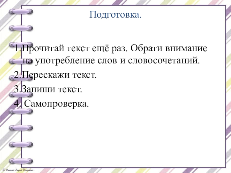 Подготовка.1.Прочитай текст ещё раз. Обрати внимание на употребление слов и словосочетаний.2.Перескажи текст.3.Запиши текст.4. Самопроверка.