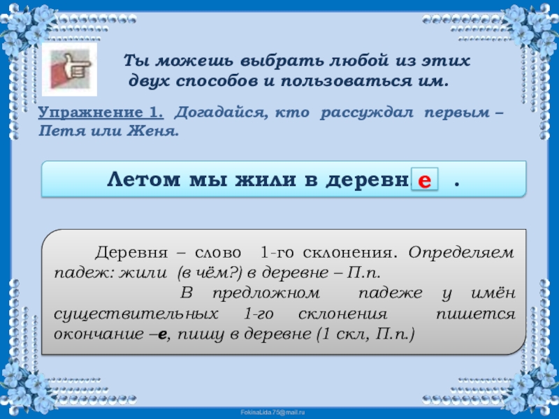 Деревня – слово 1-го склонения. Определяем падеж: жили (в чём?) в деревне – П.п.