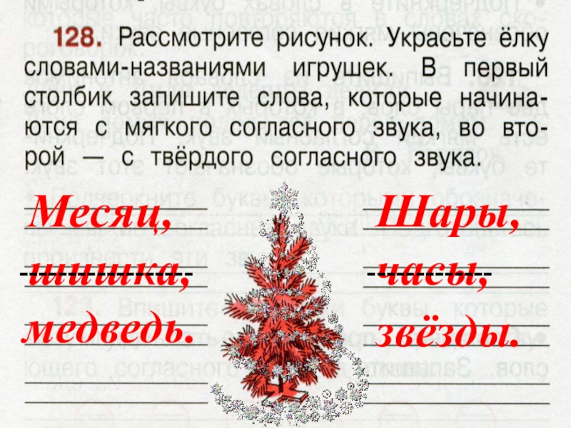 Месяц,шишка,медведь.Шары,часы,звёзды.-------------------------------