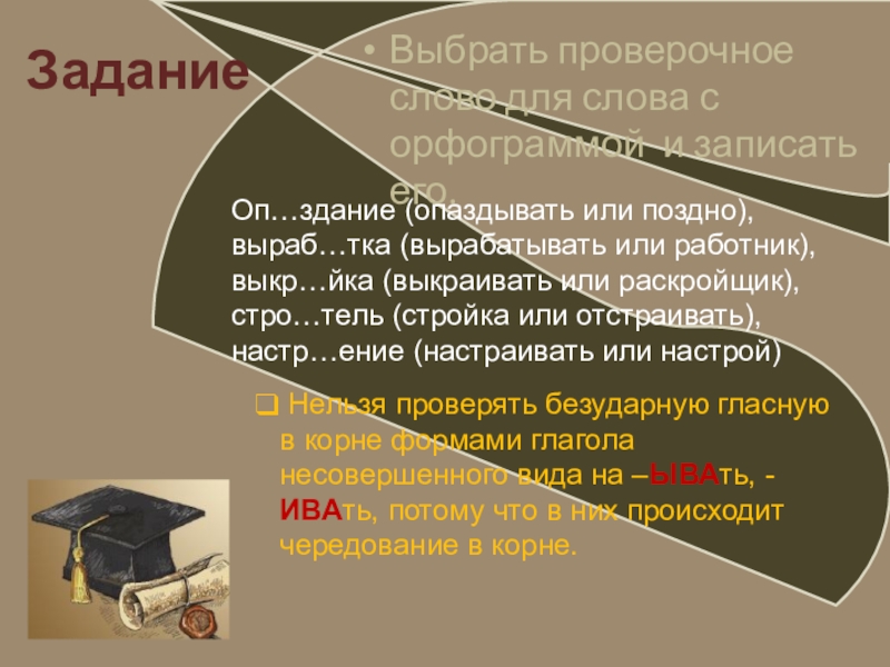 Нельзя проверять безударную гласную в корне формами глагола несовершенного вида на –ЫВАть, - ИВАть, потому что в них происходит чередование в корне.
