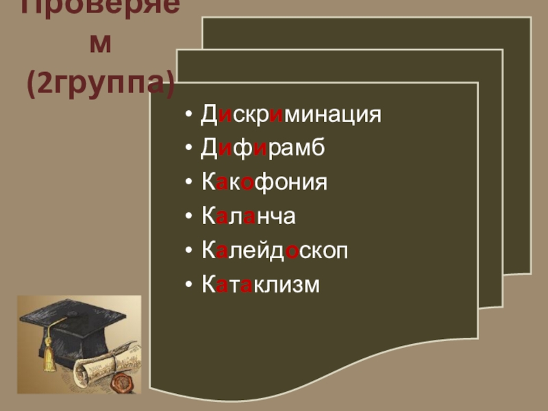 2 группа: со слова д…скр…минаця до к..т…клизм;