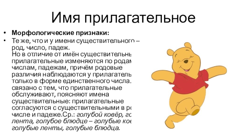 Но в отличие от имён существительных, прилагательные изменяются по родам, числам, падежам, причём родовые различия наблюдаются у прилагательных только в форме единственного числа. Это связано с тем, что прилагательные обслуживают, поясняют имена существительные: прилагательные согласуются с существительными в роде, числе и падеже.Ср.: голубой ковёр, голубая лента, голубое блюдце – голубые ковры, голубые ленты, голубые блюдца.