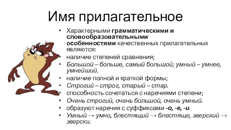Характерными грамматическими и словообразовательными особенностями качественных прилагательных являются: