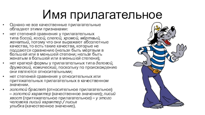 сравнения у прилагательных типа босой, косой, слепой, хромой, мёртвый, женатый, потому что они выражают абсолютные качества, то есть такие качества, которые не поддаются сравнению (нельзя быть мёртвым в большей или в меньшей степени; нельзя быть женатым в большей или в меньшей степени);