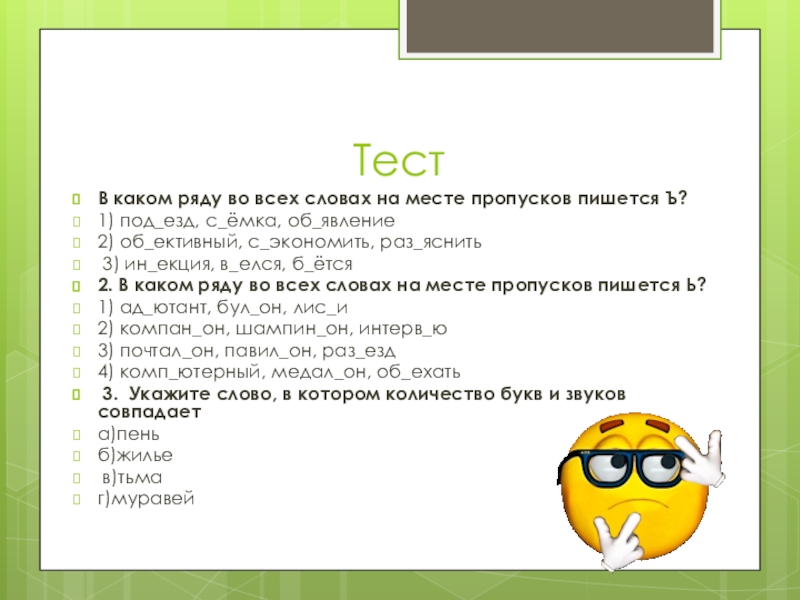 Тест В каком ряду во всех словах на месте пропусков пишется Ъ? 1) под_езд, с_ёмка, об_явление 2)