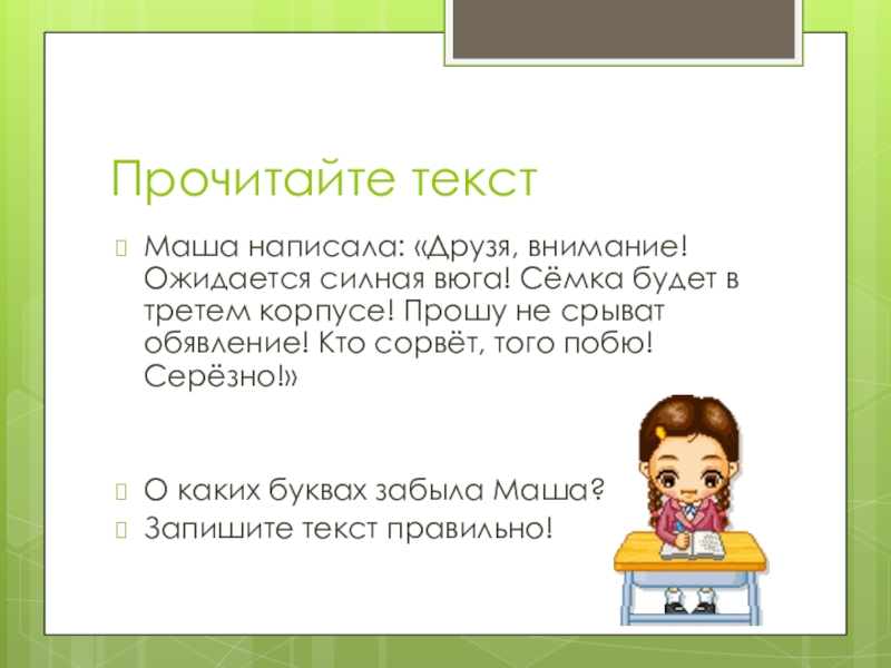 Прочитайте текстМаша написала: «Друзя, внимание! Ожидается силная вюга! Сёмка будет в третем корпусе! Прошу не срыват обявление! Кто сорвёт, того побю! Серёзно!»О каких буквах забыла Маша? Запишите текст правильно!