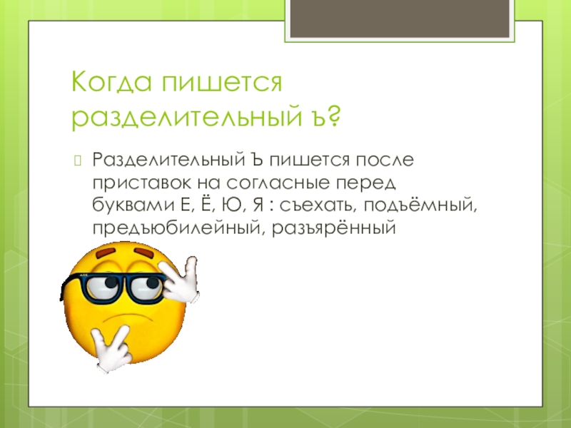 Когда пишется разделительный ъ?Разделительный Ъ пишется после приставок на согласные перед буквами Е, Ё, Ю, Я :