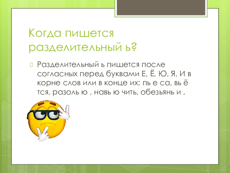 Когда пишется разделительный ь?Разделительный ь пишется после согласных перед буквами Е, Ё, Ю, Я, И в корне