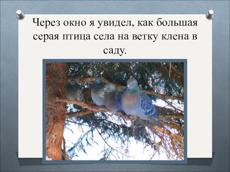 Слайд 15Через окно я увидел, как большая серая птица села на ветку
