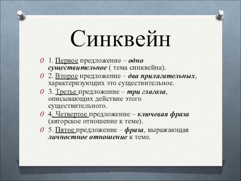 Синквейн 1. Первое предложение – одно существительное ( тема синквейна).2. Второе предложение – два прилагательных, характеризующих это существительное.3. Третье предложение – три глагола, описывающих действие этого существительного.4. Четвертое предложение – ключевая фраза (авторское отношение к теме).5.