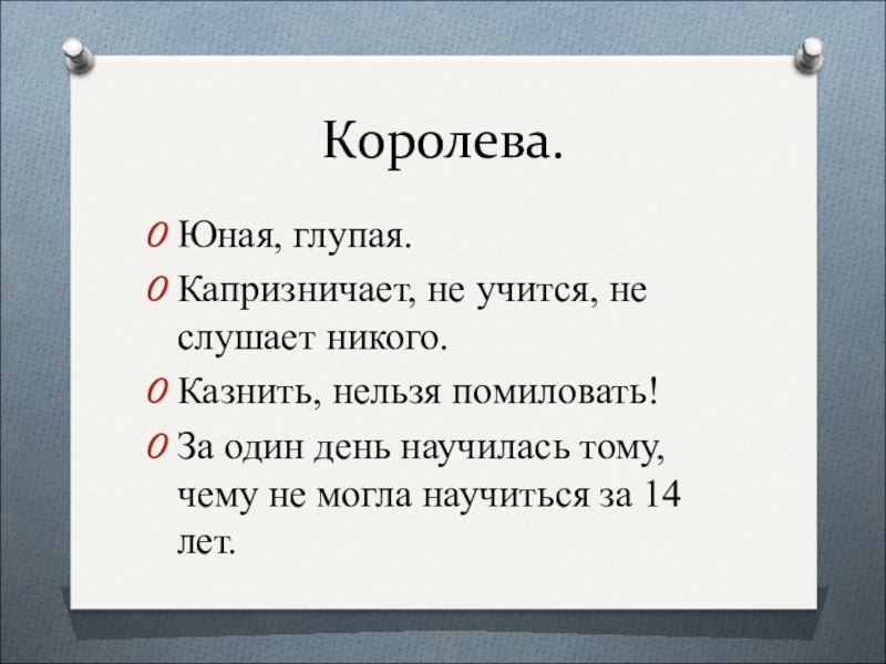 Королева.Юная, глупая.Капризничает, не учится, не слушает никого.Казнить, нельзя помиловать!За один день научилась тому, чему не могла научиться