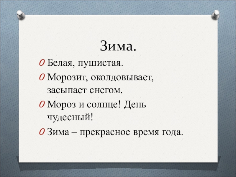 Зима.Белая, пушистая.Морозит, околдовывает, засыпает снегом.Мороз и солнце! День чудесный!Зима – прекрасное время года.