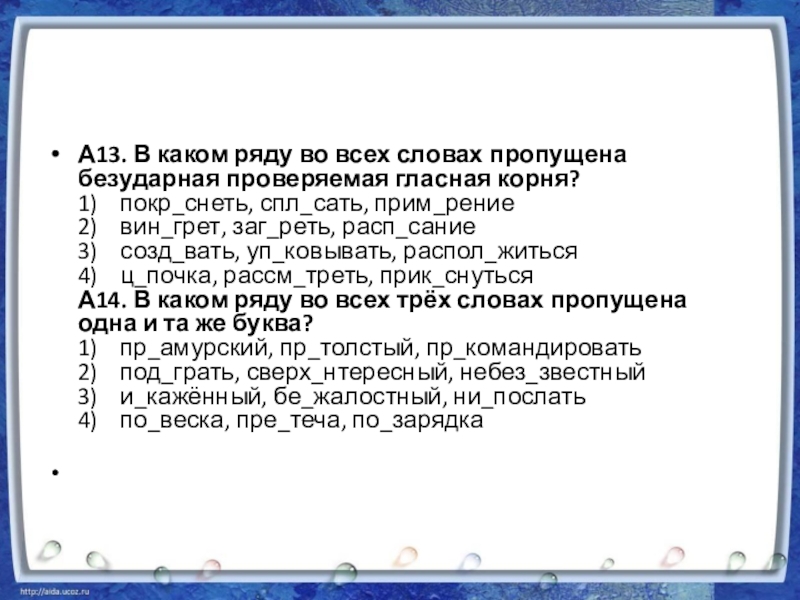 Слайд 4А13. В каком ряду во всех словах пропущена безударная проверяемая гласная