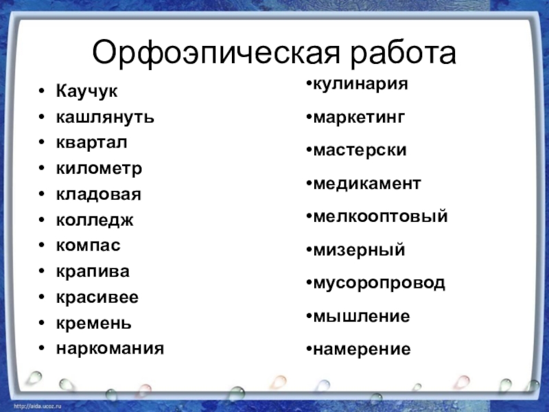 Орфоэпическая работаКаучук кашлянутькварталкилометр кладоваяколледжкомпас крапивакрасивеекременьнаркоманиякулинария маркетингмастерскимедикамент мелкооптовыймизерныймусоропровод мышлениенамерение