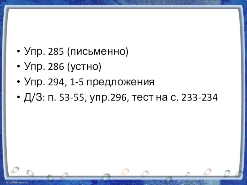 Упр. 285 (письменно)Упр. 286 (устно)Упр. 294, 1-5 предложенияД/З: п. 53-55, упр.296, тест на с. 233-234