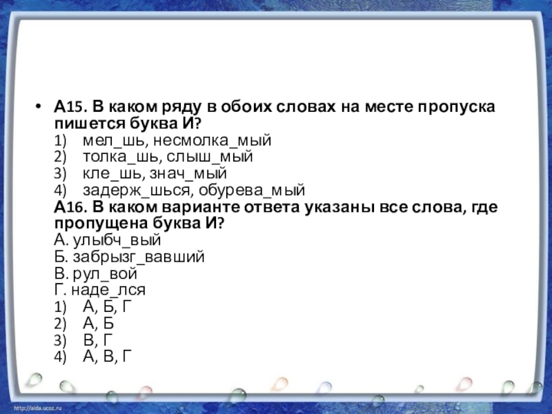 буква И? 1)    мел_шь, несмолка_мый 2)    толка_шь, слыш_мый 3)    кле_шь, знач_мый 4)    задерж_шься, обурева_мый А16. В каком варианте ответа указаны все слова, где пропущена буква И? А. улыбч_вый Б. забрызг_вавший В. рул_вой Г. наде_лся 1)    А, Б, Г 2)    А, Б 3)    В, Г 4)    А, В, Г