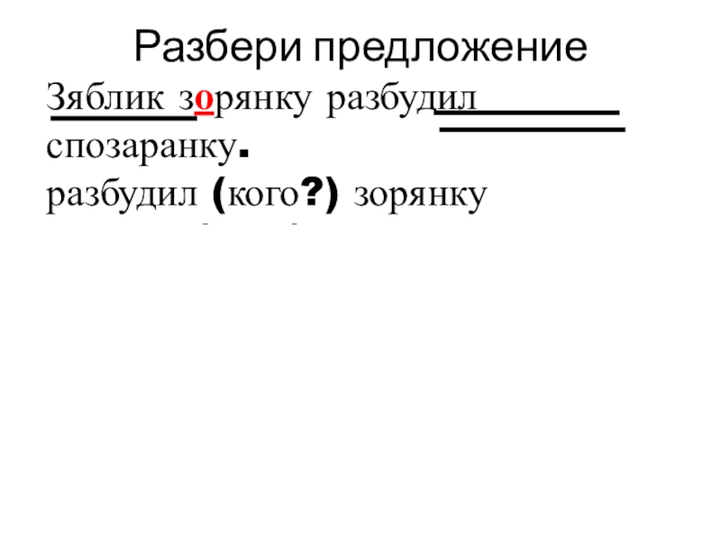 Разбери предложениеЗяблик зорянку разбудил спозаранку.разбудил (кого?) зорянкуразбудил (когда) спозаранку