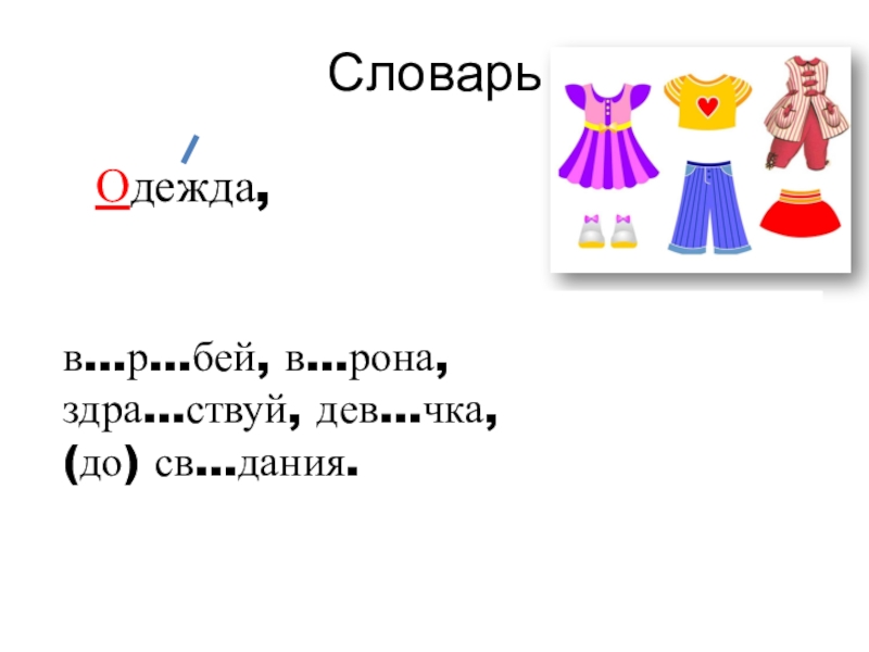Словарь 	Одежда,в…р…бей, в…рона, здра…ствуй, дев…чка, (до) св…дания.