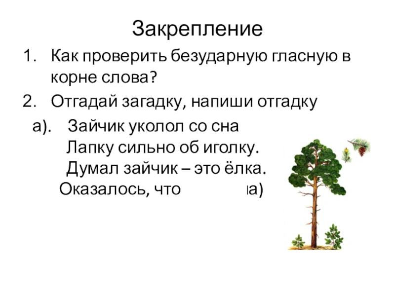 ЗакреплениеКак проверить безударную гласную в корне слова?Отгадай загадку, напиши отгадку а).  Зайчик уколол со сна