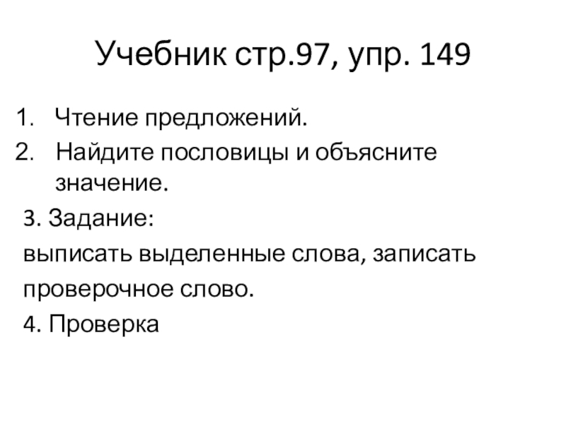 Учебник стр.97, упр. 149Чтение предложений.Найдите пословицы и объясните значение.3. Задание: выписать выделенные слова, записать проверочное слово. 4.