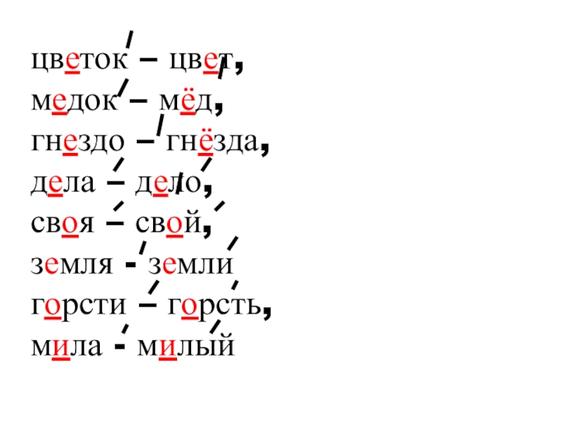 цветок – цвет, медок – мёд, гнездо – гнёзда,дела – дело, своя – свой, земля - землигорсти