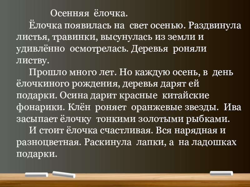 Ёлочка появилась на свет осенью. Раздвинула листья, травинки, высунулась из земли и удивлённо осмотрелась. Деревья роняли листву.