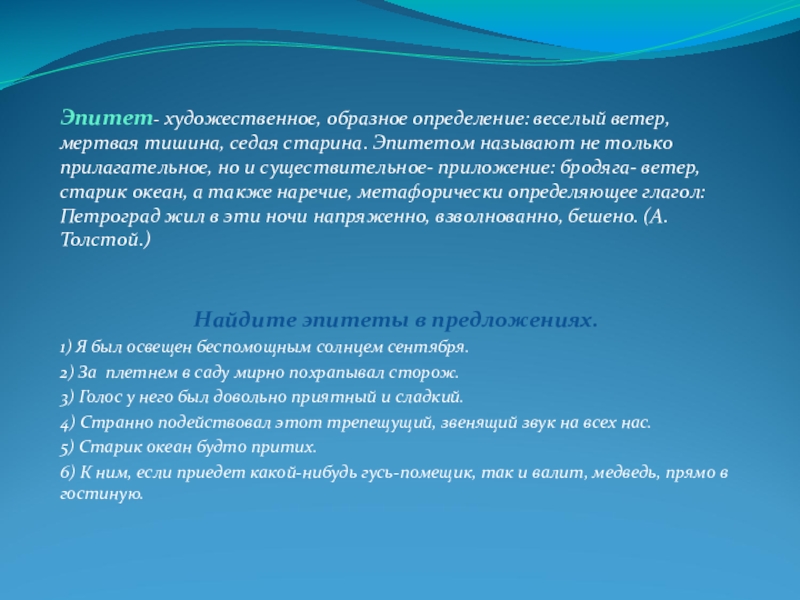 Слайд 7Эпитет- художественное, образное определение: веселый ветер, мертвая тишина, седая старина. Эпитетом