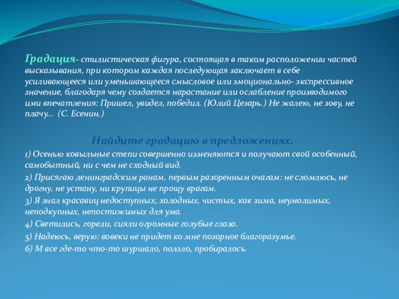 Слайд 14Градация- стилистическая фигура, состоящая в таком расположении частей высказывания, при котором