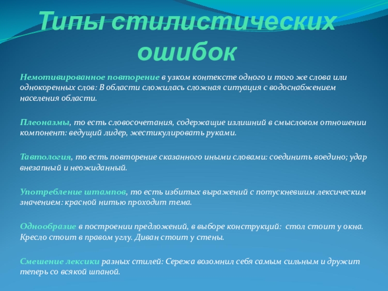 Слайд 19Типы стилистических ошибок