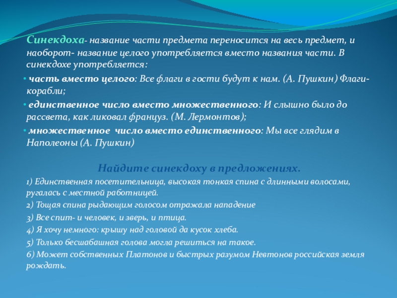 Слайд 6Синекдоха- название части предмета переносится на весь предмет, и наоборот- название