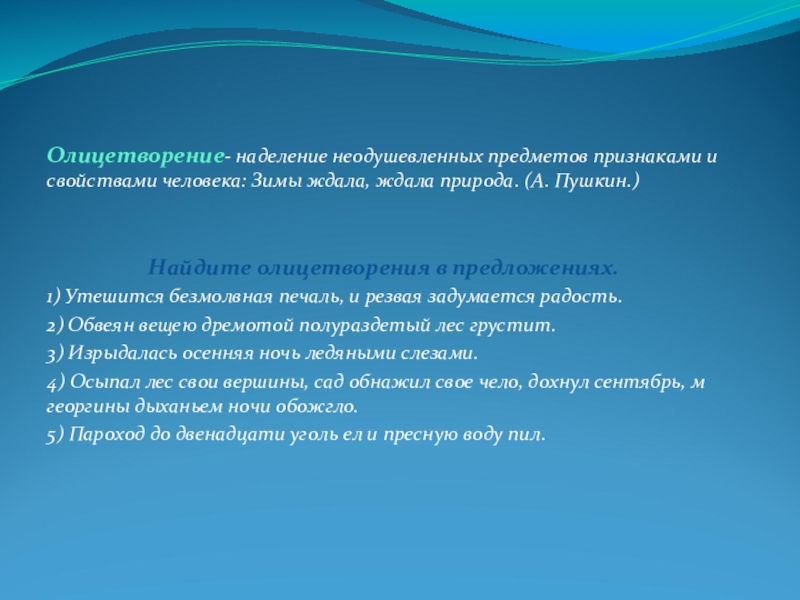 Слайд 12Олицетворение- наделение неодушевленных предметов признаками и свойствами человека: Зимы ждала, ждала