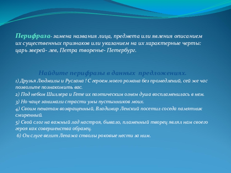 Найдите перифразы в данных предложениях.