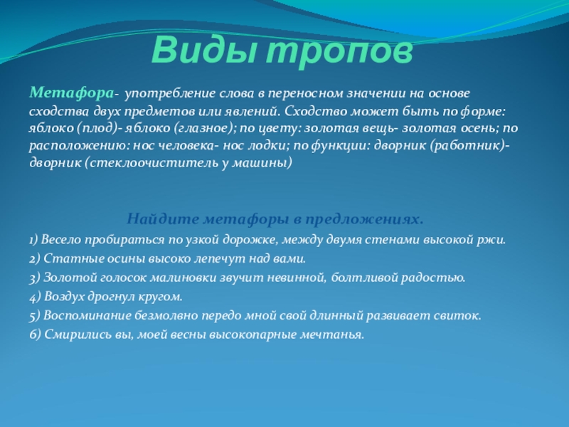 Тропы, то есть обороты речи, в которых слово или выражение употреблено в переносном значении в целях достижения большей выразительности.
