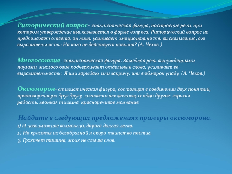 Слайд 16Риторический вопрос- стилистическая фигура, построение речи, при котором утверждение высказывается в