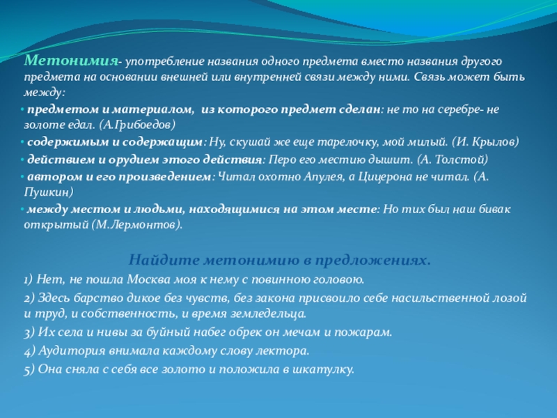 Слайд 5Метонимия- употребление названия одного предмета вместо названия другого предмета на основании