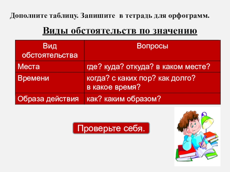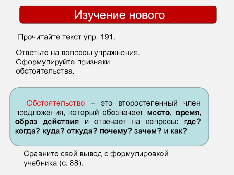 Обстоятельства отвечают на вопросы: где? когда? куда? откуда? почему? зачем? и как?