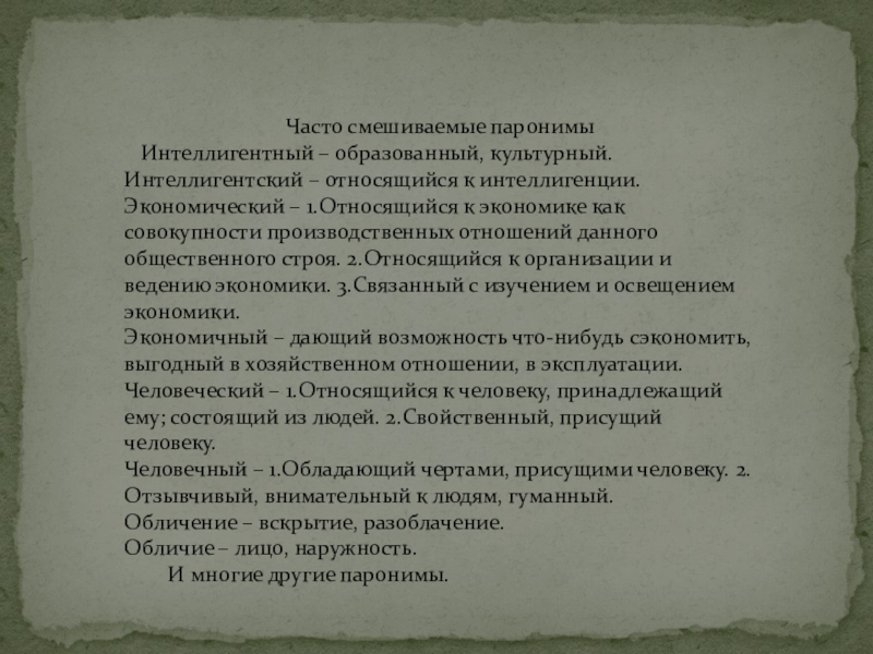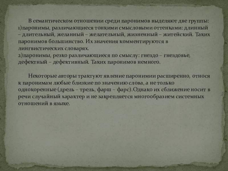 1)паронимы, различающиеся тонкими смысловыми оттенками: длинный – длительный, желанный – желательный, жизненный – житейский. Таких паронимов большинство. Их значения комментируются в лингвистических словарях.